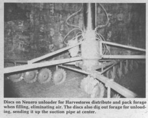 "Our equipment works well in Harvestores because it does away with the expensive maintenance of bottom unloaders and packs the silage as it's loaded. As a result, Neuero-equipped Harvestores hold 1/3 more silage," says Neuero representative Mike Hill, noting that silage is so tightly packed all oxygen is squeezed out and spoilage eliminated. "The quality of our silage is as good or better than any so-called sealed unit."