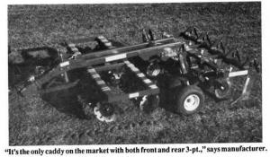 "It's the only caddy on the market equipped with both front and rear 3-pt. hitches. Or you can use a pull-type hitch on the rear," says John Buman, Ken-Lee Distributing, Harlan, Iowa. "The result is great flexibility. You can use many different combinations of implements for either till-age or planting. For example, you can mount a single coulter bar disk on the front 3-pt. hitch and a drill at the rear for no-till planting. In soybean ground, you can raise the single coulter bar disk and plant without any tillage. You can mount a tank on the frame and a single coulter bar equipped with fertilizer injection knives on the front 3-pt. hitch to apply fertilizer at planting. Ridging cleaners can be mounted on the front 3-pt. hitch allowing you to build ridges and plant right on them using the rear 3-pt. hitch or pull-type hitch.