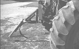 He mounted a single, spring-loaded chisel plow shank on a triangular-shaped frame that fits his 3-pt. Then he made a bracket to fit the back side of the chisel shank that holds a 2-in. dia. metal tube. The tube extends out behind the shank, running as deep as the chisel plow shovel.