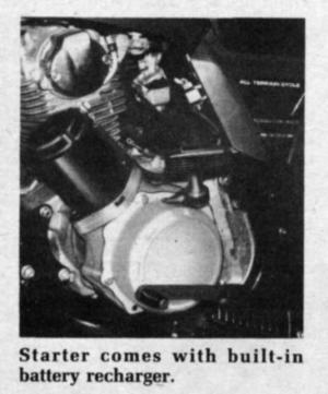 The electric start kit comes complete with all mounting adaptors, cranking motor, battery box (battery not included), mounting hardware, wiring harness and electrical hookups, starting switch, and detailed installation instructions. Fits most Hondas and Suzukis and the company hopes to develop the kit for other manual start ATV's as well. Prices range from $190 to $250, depending on make and model.