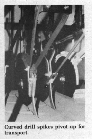 The spike assembly bolts directly in front of openers that run in the tire tracks. Spikes are designed to pull themselves, and the discs, down into the packed soil, cutting a groove 3/8 in. wide and 1 to 1¢ in. deep which gets the seed down into moist soil so it'll sprout along with the rest of the seed. No heavier springs are needed.