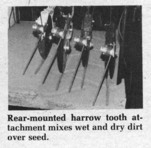 The wheel track spikes, available for nearly every make of drill, sell for $15 to $17 apiece. Replacement spikes alone sell for $5. Ryden also makes a harrow tooth drill attachment that fastens behind the disc opener and ahead of the press wheel. The harrow tooth mixes wet and dry dirt over the seed, helping eliminate the need for after-harrowing to cover uncovered seed.
