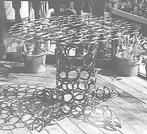 To make the furniture, Gonzales simply welds the horseshoes together, bending them first when necessary. His horseshoe furniture collection includes love seats, tables, rocking chairs, bar stools, boot jacks, plant stands, towel holders, candle holders, flower pot holders, clocks, key holders, and a pair of roping cowboys next to a covered wagon. He even built an ornamental grape cluster and a 5-ft. high horseshoe Christmas tree.