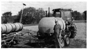 "I was already using Na-Churs liquid fertilizer applied at planting time through an attachment mounted between the seed fur-row openers, putting it 3/4 in. to the side of the seed. The Na-Churs is carried in plastic tanks mounted on the planter frame and applied by a squeeze pump. I decided I could just as well do the whole job - fertilizer and nitrogen - at the same time by switching to liquid N.
