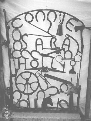 "Don made two more gates for his daughter, Connie, and grand daughters Holly and Sara. On one of these gates he used horse-shoes to spell out names. All three gates get a lot of attention from passersby who often slow down to get a better look, but no one appreciates them more than his own family.