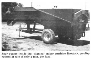 A first of its kind feed mixer from Blair Mfg., Blair, Neb., features a "slant auger" design for mixing live-stock and poultry rations ù from all grain to all roughage and any and all combinations in between ù in only 2 min. per load.
