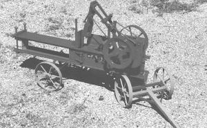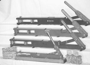 Schulz also makes 1/16 and 1/8 scale hand-operated, portable antique balers that can make bales from lawn clippings, wood shavings, shredded paper, corn husks, wheat straw, alfalfa, etc. The balers have a wooden plunger and are operated by pushing on a wooden lever. Material is pushed into a hole on top of the chamber, then the lever is pushed forward. It takes about five "loads" of material to make a complete bale. The 1/16-scale baler makes 7/8 by 1 3/8 by 3-in. bales while the 1/8-scale baler makes 1 7/8 by 2 7/8 by 6-in. bales.