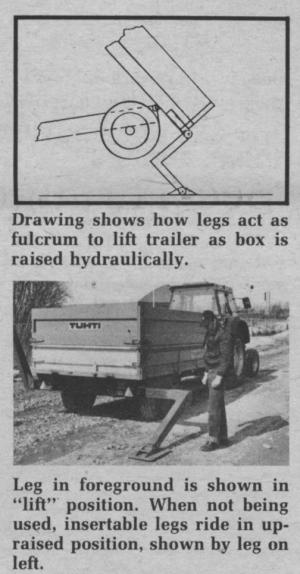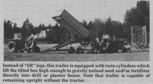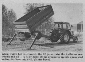 In the "lift" position, the legs are far enough apart to straddle drills up to about 10.ft. wide. Well-built trailers, with a sturdy undercarriage to support the loaded trailer, can be left upraised on the support legs and a tongue stand while the tractor is unhitched and driven off for use elsewhere.