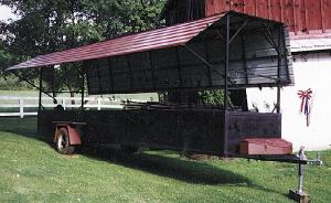 The pit is 4 ft. wide and 21 ft. long. The axle is a shortened house trailer axle and the floor is made out of 1/2-in. thick steel plate. We used 2-in. angle iron to build the frame as well as the top edge around the pit. We used 2-in. sq. tubing to form the tongue and 2-in. angle iron to make supports. The sides are made out of 1/8-in. thick sheet metal, and the four corner uprights are made out of 2-in. sq. tubing. The roof is framed with 1-in. sq. tubing and covered with steel roofing.