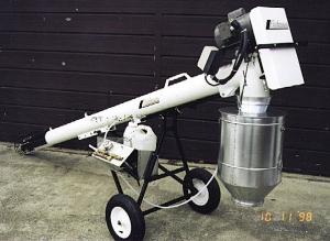 Our Auger System is a 7-in. dia., 12-ft. long auger with a seed treating hopper over the down spout. It can be electric or hydraulic powered. Can be easily moved from place to place on its own wheels.