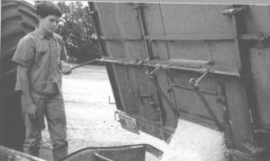 Unloading grain is much easier and safer with "The Handi-Arm," produced by Calmar Industries Ltd.. in Saskatoon, Saskatchewan. This locking device for truck end gates eliminates the need for stretching over the top of the auger to open the door or control grain