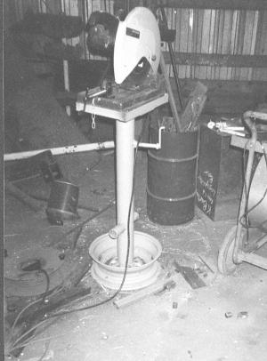 Cutting steel is easier now that he mounted his chop saw on a table. To make the table, Bennett built an angle iron frame to fit around the base of the saw. The frame is welded to a pipe which slides into a larger pipe welded to an old wheel. This makes the table height adjustable. He also has a couple of adjustable support rollers to hold up heavy materials while he cuts it.