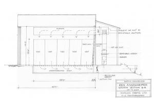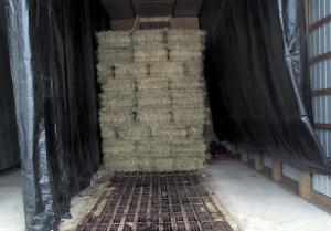 A bale wagon unloads the stacks onto the floor grates, and when the unit is filled to capacity, tarps are lowered along the sides of the stacks. A vacuum is created by a 15 hp axial fan in the pit below each of the 800-bale stacks and this pulls the tarps tightly against the stack. A 3 hp axial fan and a 1.2 million BTU natural gas heater are turned on to supply 140 degree F air to the plenum above the stack. Heated air is drawn down through the nine-layer stack, effectively drying it at a cost of $10 to $12 per ton.