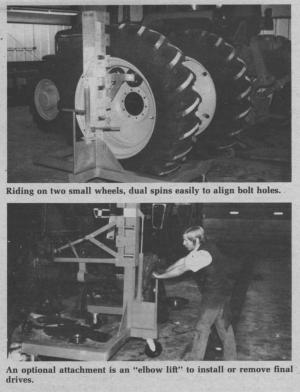 Besides the attachment for changing tractor duals, the Duo jack has several other unique shop attachments that are attracting farmers and implement dealers. One is an "elbow lift" attachment with a ratchet jack for the removal and/or replacement of final drives with precise horizontal, vertical, and perpendicular plane alignment.