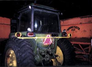 The lights on Neisen's extending light bar are normal 12-volt emergency flashers. He wired these to a regular extension cord, leaving the female plug intact. Another length of extension cord wires into the tractor, with the male plug on the loose end.