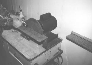 The two men also came up with a handy high-speed sander-buffer for polishing steel shafts and also for rounding wood. It's a high-speed emery blade mounted on an electric motor, mounted parallel to a small work table. They say it works as well on wood as metal because it doesn't "fill" with gunk as it's used.
