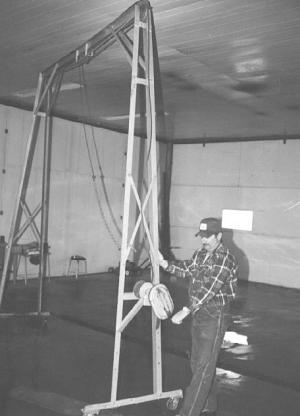 Richard Cox, Jacksonville, Ill.: Richard and friend, Buddy White, Jacksonville, Ill., made this shop hoist from parts salvaged from an old portable elevator and a wagon hoist. A hand-cranked winch mounts on the side of the hoist and runs up through pulleys on top. The lift rolls back and forth across the top of the hoist.