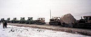 With the anchor chain hooked to the skid, they put together a team of "horses" big enough to get the job done. Directly in front of the rock hooked together in single file was a D-8, a D-7, four older model Steiger 4x4s, and in the lead a brand new Deere 9200 4x4, loaned to them by their dealer Faga Jorgenson. With those seven tractors pulling (close to 3,000 hp in all) and the D-6 and D-8 pushing from behind, they headed down the road - i