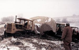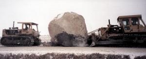 "We tried to move it by rolling it, but we just couldn't get it to go over," Robert says. Pushing with their D-6 along with two bigger borrowed Caterpillars, and pulling with a couple of Steigers, they managed to get the rock to the edge of the field in about two weeks. "At first, on a good day, we'd move it about three inches," Robert notes.