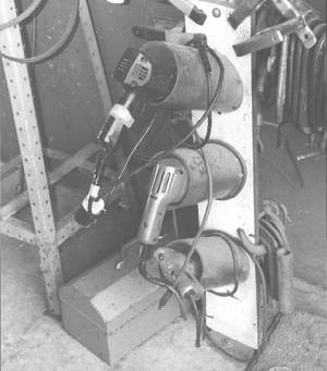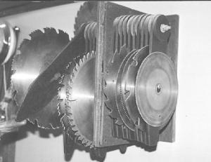 Brandenburger also came up with a nifty way to store saw blades. He uses a lot of different circular saw blades and wanted a way to keep them in good order. He came up with a wall-mounted storage bracket with twenty swinging arms that each hold a blade. The arms hang freely from a long bolt that runs through a plywood brace at the center of the bracket. The blade hangs loosely on a peg at the middle of each arm. The arms extend down below the blade so you can grab it with your hand, swing it up, and pull the blade off. The entire blade holder takes up only about 2 sq. ft. of wall space.