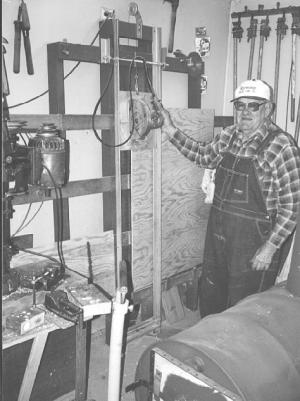 Another idea that works well for Brandenberger is a vertical plywood cutting table. It gives him fast and accurate cuts every time. The power saw slides up and down inside an angle iron track. It's held by a cable that runs up over a pulley at the top. A weight on the cable is slightly heavier than the saw so it moves easily up and down. A bit of down pressure is all that's needed.