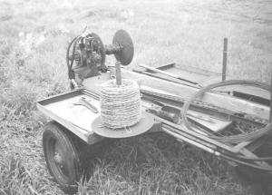 He mounted a small gearbox off an old combine at the back of a trailer that he made out of the running gear from a grain elevator. A hydraulic motor chain-drives the gearbox. Home built spools û made with 1-in.dia.pipe and concave disc blades û roll up wire.