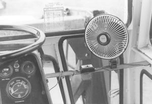 Capiuk found a very simple, yet effective solution. He gave up on his air conditioner and simply installed a $20 electric fan in the cab instead. By bolting a section of metal strap across the right front corner of the cab, he created an ideal place to mount the fan for optimum air circulation. He then hooked the fan onto a live wire off the key switch.