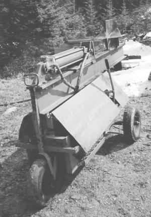 The splitter rides on three 14-in. wheels and is equipped with a 4 by 16 hydraulic cylinder that mounts on top of a 10-in. wide steel I-beam. The 14-in. high, 12-in. wide wedge is made from 3/8-in. thick steel. It consists of a vertical blade and a pair of horizontal blades welded onto the sides. The combination of the vertical and horizontal blades allows the log to be split into four pieces.