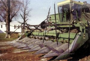 Meteer Mfg. COMBINES Down Corn 25-5-26 Meteer's "Down Corn Reel" is equipped with revolving fingers that feed corn into the head. The reels can be left on at all times and don't need to be removed in standing corn. The reel is operated by a hydraulic motor and chain drive system.