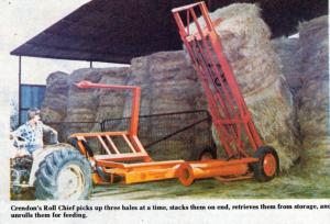 Says Michael Fry, inventor and manufacturer of the Crendon Roll Chief: "The advantage is being able to either stack three-high in a shed, lay them in a row out in the field, or roll them out for feeding with only one machine. The only time you leave the tractor is to remove the twine."