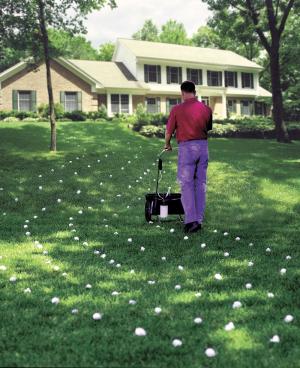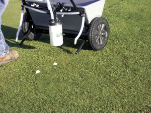 Their latest marker fits smaller home-owner sized spreaders or sprayers up to 30 in. wide, operated at normal walking speeds of about 3 mph. It has a single 32-oz. tank and a small air pump that's powered by a single D cell battery.