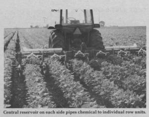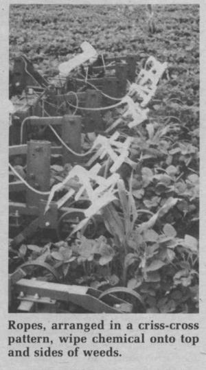 A central reservoir pipes chemical to individual row units. Ropes, arranged in a criss-cross pattern, wipe chemical on the tops and sides of weeds. Shearer says the applicators do not interfere with the use of cultivator row shields so they can be used early in the season to kill fast-growing weeds, such as milkweed, when they are still easy to kill.