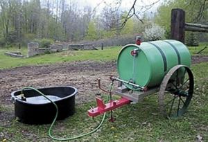 He put the barrel and trailer together and added some plumbing parts to make a perfect wagon for hauling water.