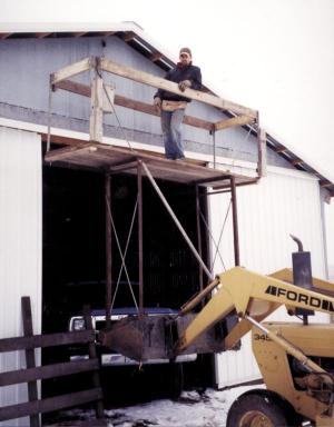 The platform stands about 9 ft. above the loader bucket and measures 10 1/2 by 3 ft. 1 in. The entire structure is made from used 2 by 8 lumber, angle iron, pipe and silo rods. The unit attaches to the bucket with five bolts and can be easily removed for storage. A safety railing around the top can be removed by lifting four pins at the corners. (Jim Feldman, 10993 Stanton Blvd., Northfield, Minn. 55057 ph 507 645-8771)