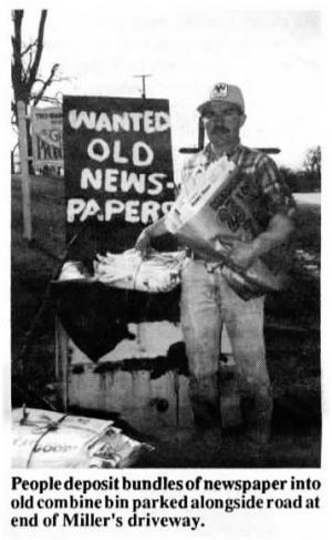 Wisconsin farmer Scott Miller, Beaver Dam, Wis., found a solution to the problem with a simple idea that provides him with a nearly unlimited supply of old newspaper. Miller simply parks an old combine bin at the end of his driveway and puts a sign on it: "Wanted - Old Newspapers" that can be seen by passersby moving in either direction on the highway that runs by his farm.