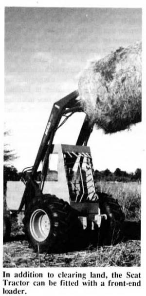 "It'll take more punishment in heavy brush than a conventional tractor because every-thing is enclosed," says Beckloff. "Tree limbs aren't likely to poke into the radiator or jerk off hydraulic hoses, and the Tuffak plastic glass on front of the cab is nearly unbreakable. It has more powerful hydrau¡lics than a skid steer loader and can go where a skid steer loader can't go because of the large tires and improved center of bal¡ance. The weight of the load is over the drive wheels which makes the tractor easy to maneuver in soft soil. It maneuvers much like a swather. The combination of rear castor wheels and hydrostatic-drive front wheels makes it possible to turn the ma-chine around in its tracks without skidding or tearing up ground."