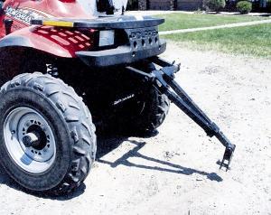 "It's a simple idea but it really comes in handy," says Brule. "I'm usually alone in my fields which are scattered out, so I use it all the time. I've even pulled it behind my pickup at speeds up to 55 mph. When I get to the field I drop off the equipment and ride the ATV back home to get whatever else I need. The hitch detaches in just a few seconds. I bought about $40 worth of steel to put it together. I pull my drill lengthwise down the road. The markers on my grain drill stick out kind of far, but the hitch on the ATV telescopes so there's plenty of clearance."