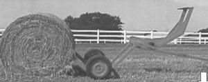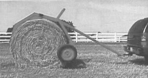 The 2-wheeled "Bale-A-Haul" is equipped with a hinged metal claw that grabs onto bales.