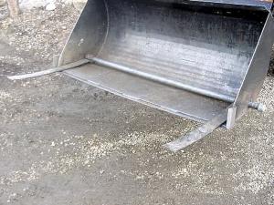 Fred cut a 1-in. dia. hole into each side of the back corners of the bucket. Then he cut a long leaf spring in half, leaving the shackle bolt holes on one end. A 1-in. dia. steel pipe was then inserted through the bucket as well as the shackle bolt holes on the leaf springs. Pipe caps hold the pipe in place.