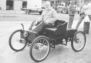Replica "Horseless" Carriage AG WORLD 28-6-23 David Irey of Edina, Minn., built a 1900 replica "horseless carriage" that's powered by an 8 hp gas engine with an added exterior flywheel. The body is made from wood and is his own design. The seat is upholstered in fake leather. An antique 1900's bicycle light mounts on front.