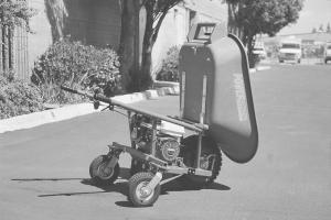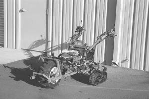 • Power Trakker - This 3-WD, hydrostatic-powered cart can be fitted with a mower, grader blade, wood chipper, log splitter, and more than 70 different hydraulic-operated attachments. The attachments pin to the frame. The rig is powered by a Honda 4 hp gas engine that chain-drives the front wheel at a 5 to 1 gear ratio. If desired, the rear wheels can be replaced with tracks.