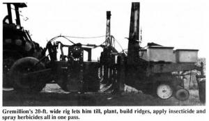 Gremillion uses the planter-tiller in corn. The only other tillage he does is to pull a disk through the field to cut up stalks. He mounts herbicide saddle tanks on the tractor. "This rig has cut our tillage and planting costs considerably due to reduced labor and equipment costs. It took a lot of figuring but once we got it in the field it worked great," he says.