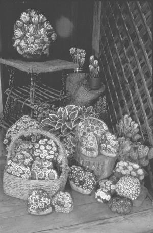 "Rocks are also suitable for painting flowers," she says, noting that she arranges the flower rocks in baskets or vases.