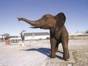 The top of the elephant's head is 9 1/2 feet off the ground. Because the blades can't be tightly fitted together, Nyberg spot-welded the sculpture with a wire-feed welder. Light can be seen between the blades and in the circle- and star-shaped holes on the blades. It took 955 lawn mower blades to complete the pachyderm, and it required a small crane and trailer to move it to join his other creations in Vining's Nyberg Park. The elephant fits right in with the alien, the astronaut, the elk, the square knot and the cockroach in a pair of pliers.
