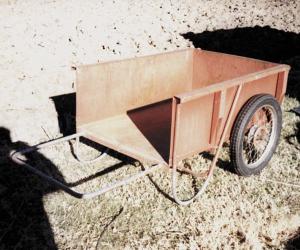You cannot overload this home-built wheelbarrow. A friend of mine bent the sheet metal. The wheels come off an old Honda 90 motorcycle. They were reamed out for brass bushings that ride on a 1-in. trailer spindle, cut down to fit. Electric conduit was bent to fit for the legs and handles.