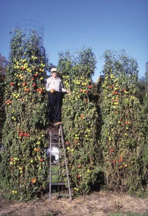 You've never seen tall tomatoes until you've seen Charles Wilber's. One cherry tomato plant reached 28 ft. 7 in. tall. They not only grow tall, they produce lots of fruit. Four plants produced 1,368 lbs. of tomatoes to earn a cover picture on the Guinness Book of Records. Pinching back suckers was a vital part of how he did it.