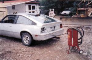 An airline runs from the compressor to the back of the car where a fitting mounts in place of the original taillight. He simply hooks his sandblaster up to that.