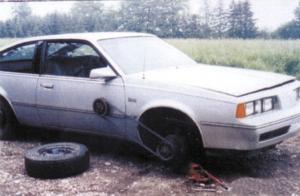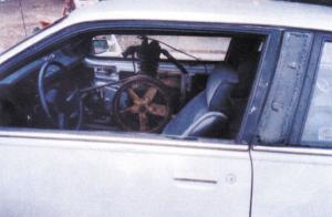His solution? Put a belt-driven air compressor in the passenger seat of a front-wheel drive Oldsmobile Firenza car. It's driven by a pulley that mounts in place of the right front wheel. The belt drives a pulley on a shaft that extends through a hole in the right front passenger door to another pulley that direct-drives the compressor.
