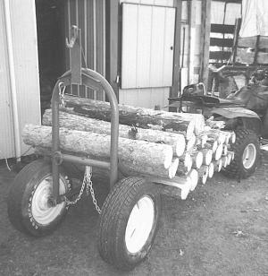 He says the hauler can carry up to 500 lbs. of cut wood or can be used to transport a single log up to 23 ft. long and 16 in. in diameter. The middle part of the unit is equipped with semi circular tubing to hold the front end of the log. There's a chain and hook on back.