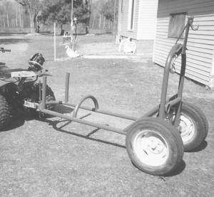 It looks like a 2-wheeled dolly hitched to an ATV. The hauler is made from steel tubing and is about 6 1/2 ft. long by 44 in. wide. It weighs about 200 lbs.
